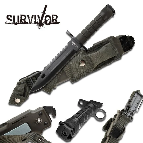 12″ Overall Length Fixed Blade Commander Survival Dagger Knife. 6.5″ Black Stainless 6Mm Blade. 5.5″ M9 Bayonet Handle, Black. Includes Hard Sheath W/ Wire Cutter & Sharpening Stone