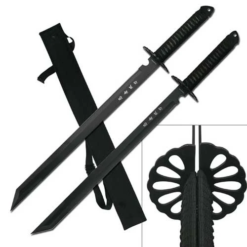 28″ Overall Length Twin Blade Full Tang Ninja Sword. 18.25″ Twin Ninja Black Stainless Steel Blade. 7.75″ Black Nylon Wrapped Handle. Includes Shoulder Strap