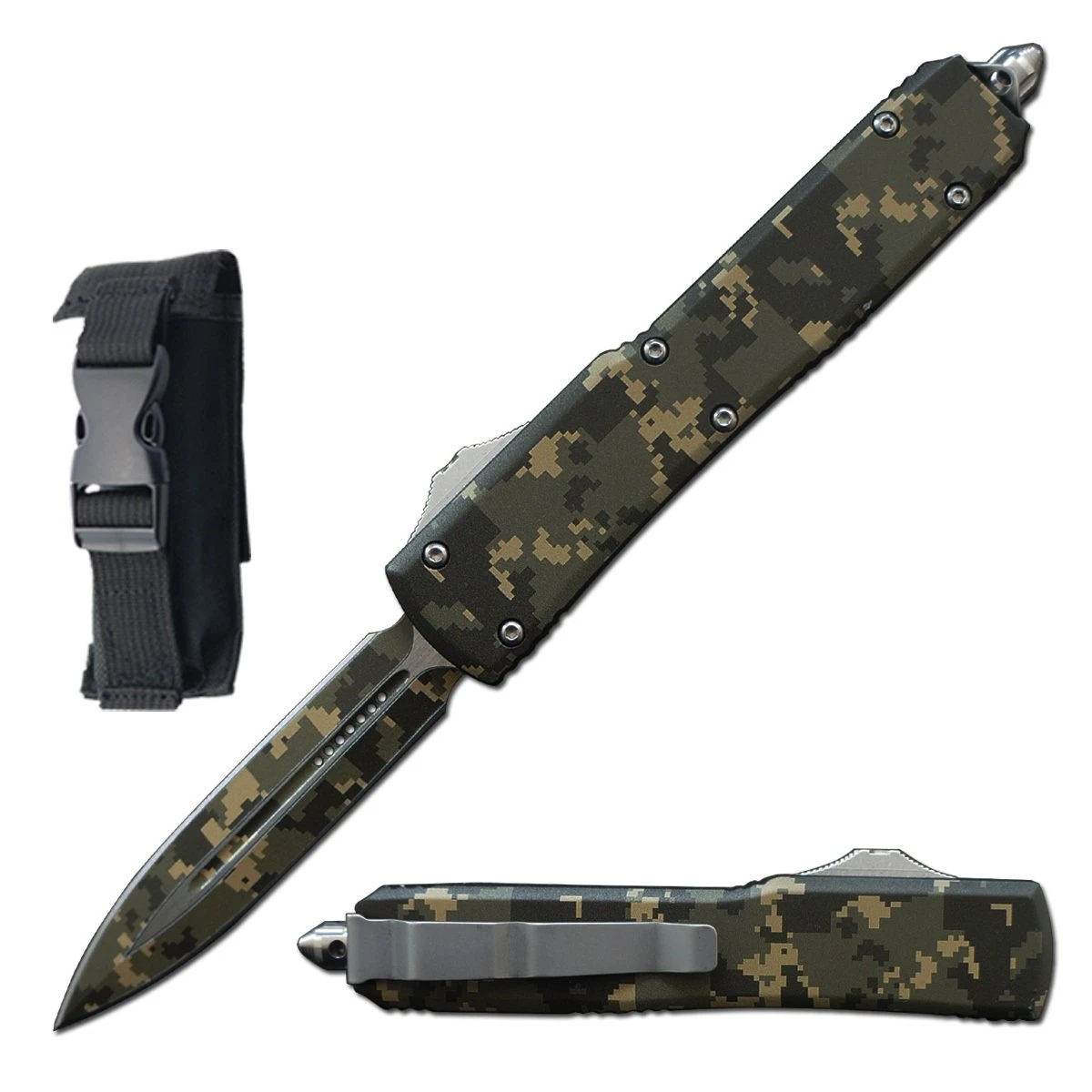 This OTF has a blade that is made from stainless steel in a spear point style with a Digital Camo finish. The dual action mechanism allows you to deploy and retract the blade with a silver slider.