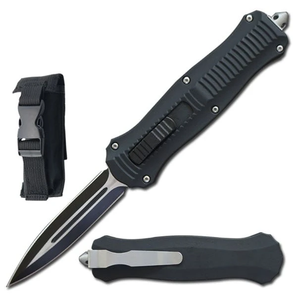 The black handle is constructed from zinc alloy. The end of the handle comes with a punch for any emergency situations that may arise. A slider is provided for deployment and retraction of this dual action blade. The movement is smooth and flawless. The stainless steel blade comes two tone black and satin finish. Included are a steel pocket clip and a quick release nylon sheath.
