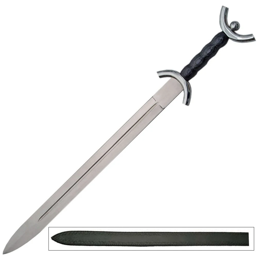 This Celtic War Sword features a wooden grip with a half moon-shaped guard and pommel that together form the likeness of a human figure. The Celtic War Sword has an overall length of 34 inches and has a stainless steel blade.