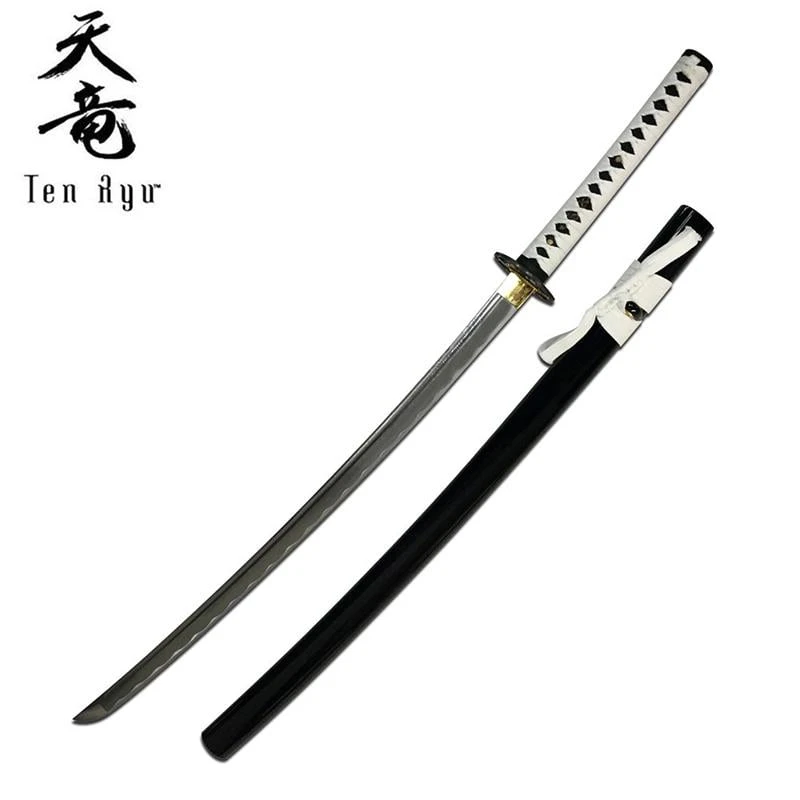 Ten Ryu 42 Inch Overall Length Handmade Sword. 30 Inch 1045 Carbon Steel Blade. 12 Inch White Cord Wrapped Handle. Black painted Wood Scabbard